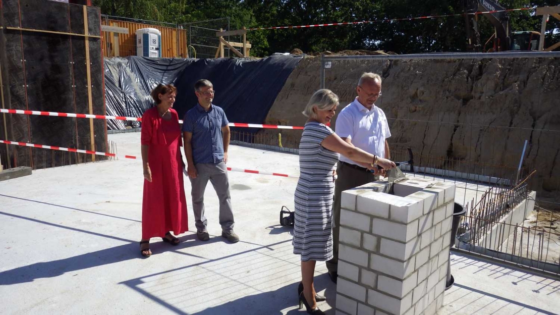Blankenfelde: Am Mittwoch, dem 25.07.2018, legten WOBAB-Geschäftsführerin Kathrin Wohlauf-Albrecht und der Bürgermeister der Großgemeinde Blankenfelde-Mahlow Ortwin Baier den Grundstein für das Gebäude.